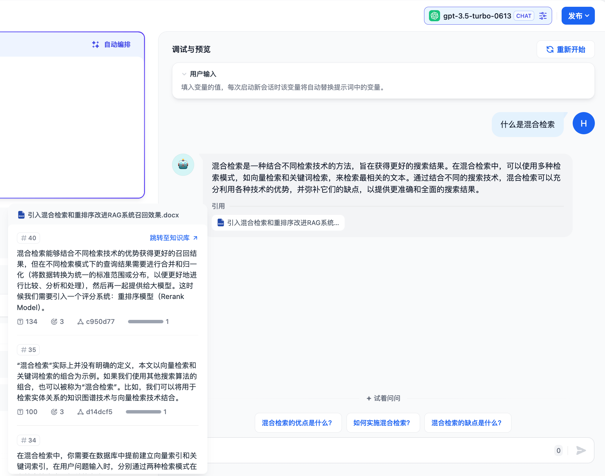 2. 选择合适的检索策略:向量检索/全文检索/混合检索,不同检索方式的优缺点,请参考扩展阅读[检索增强生成(RAG)](user-guide/zh-cn/user-guide/learn-more/extended-reading/retrieval-augment/);