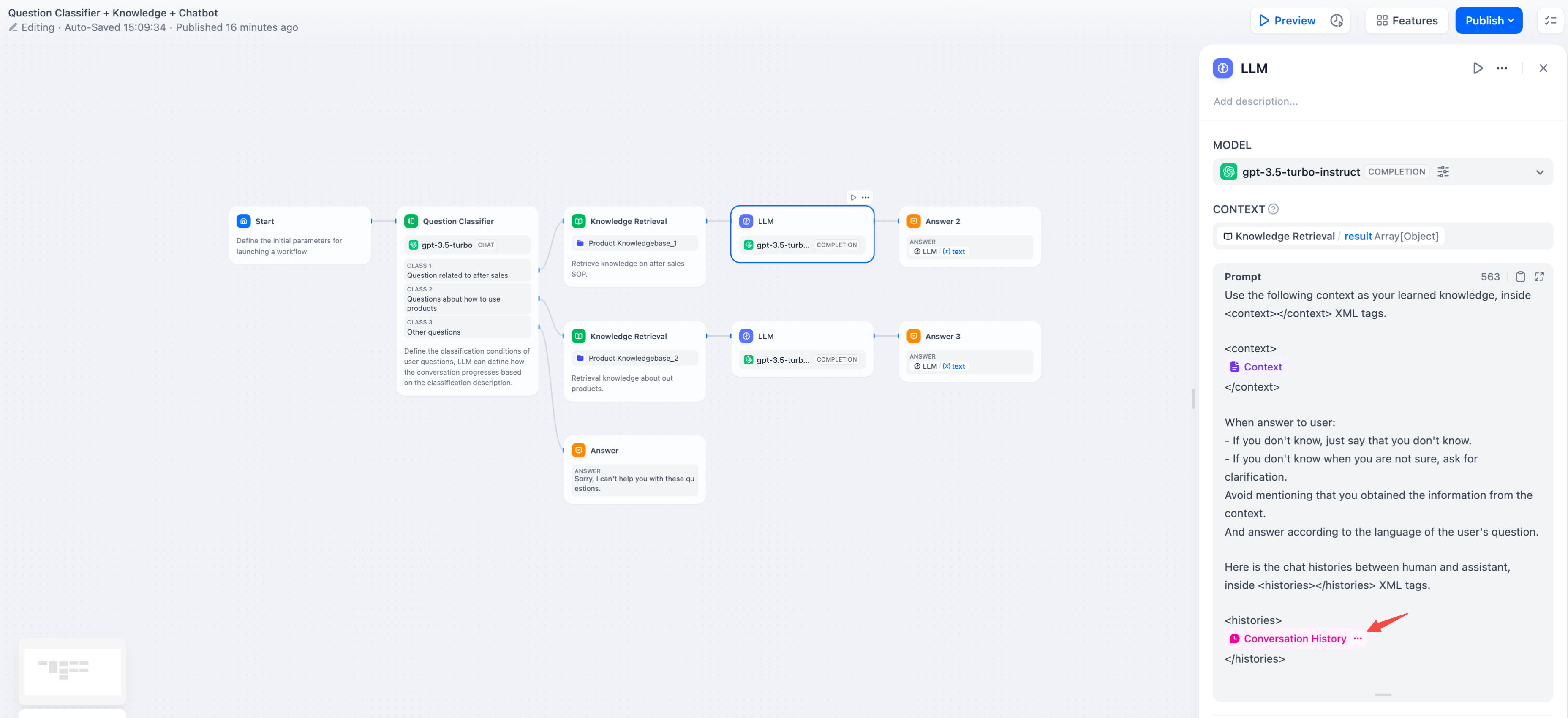 3. Chatflow has built-in chat memory (Memory) for storing and passing multi-turn conversation history, which can be enabled in node like LLM and question classifiers. Workflow does not have Memory-related configurations and cannot enable them.
