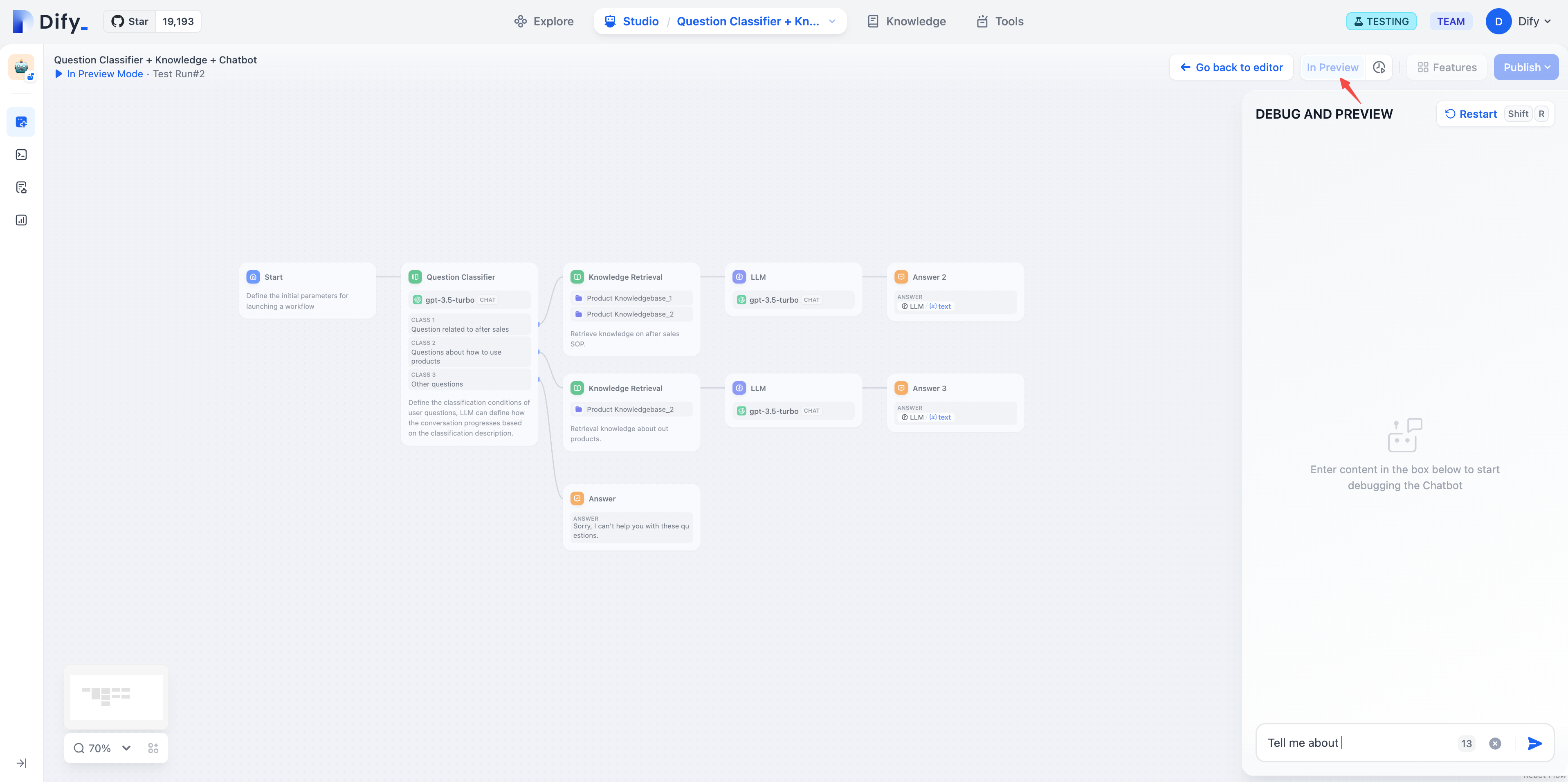 Difyワークフローでは、完全な実行とデバッグ機能を提供しています。対話型アプリケーションでは、クリック「プレビュー」でデバッグモードに入ります。