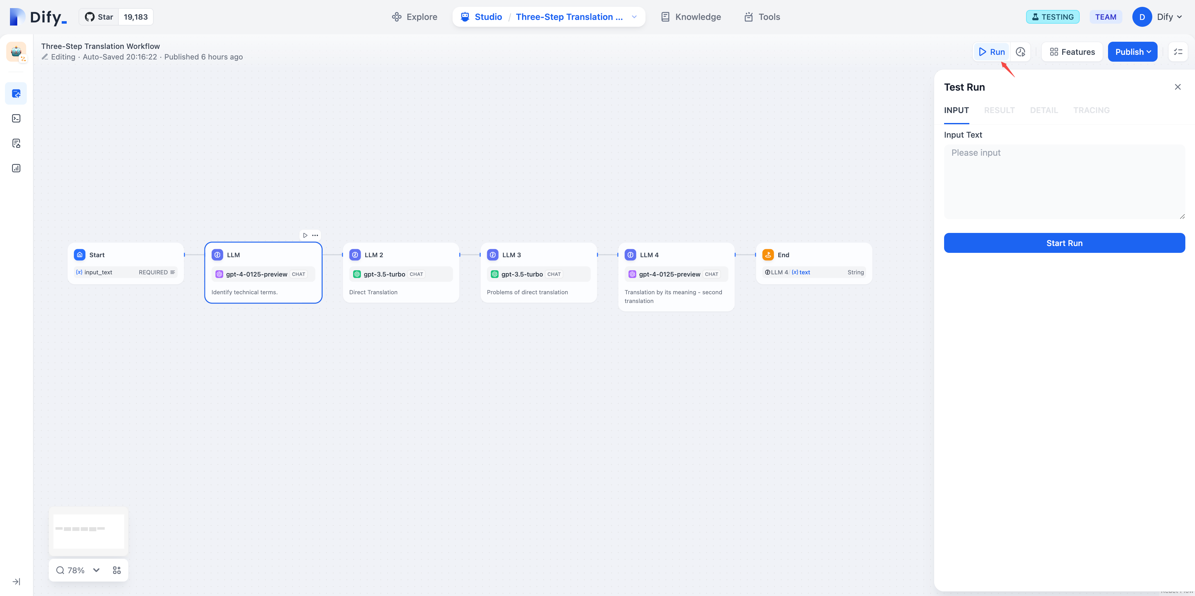 ワークフローはノードのステップの実行をサポートしており、ステップを実行中に現在のノードの実行が期待通りかどうかを繰り返しテストすることができます。