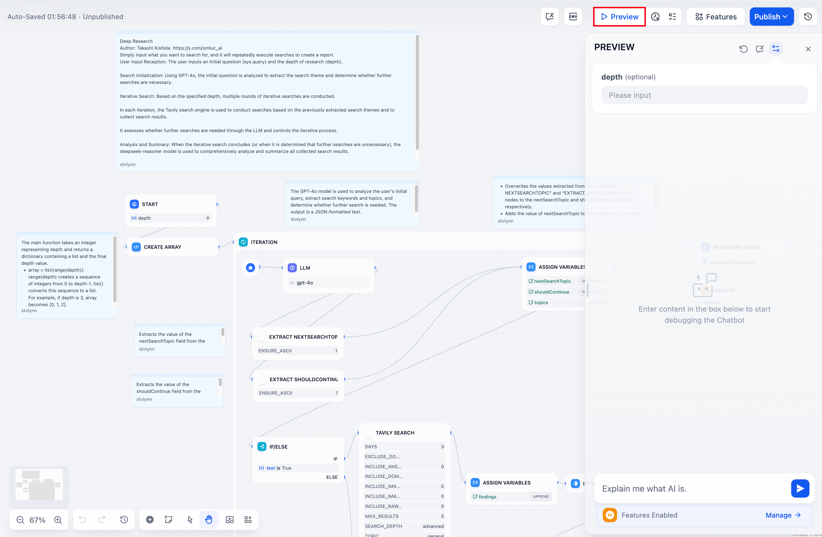 Dify Workflow 提供了一套完整的运行调试功能,在对话型应用中点击「预览」进入调试模式。