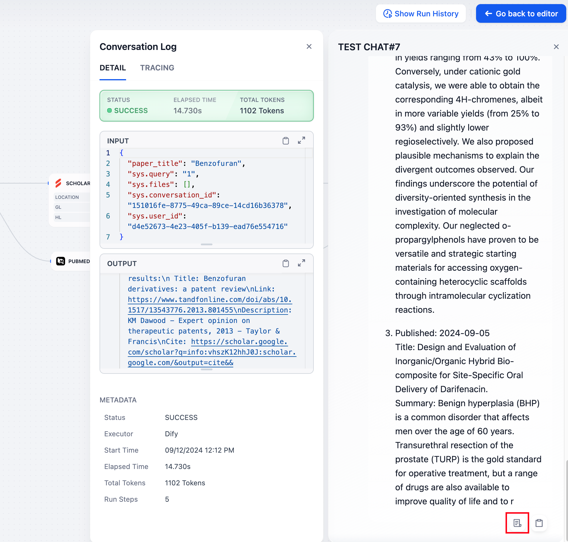 在「运行历史」中可以查看当前工作流历史调试的运行结果和日志信息。