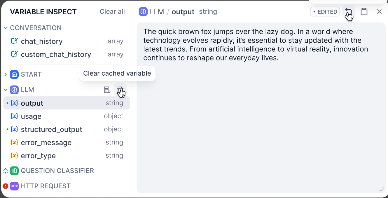 为了便于查看整体的变量所承载的背后数据,以及帮助开发者通过变量更好的调试应用,变量池可以帮助开发者管理当前工作流应用内所涉及的所有变量所对应的数据,它展示工作流中所有已创建变量及其当前值,包含节点输出变量、会话变量/循环变量。其状态为可编辑/清除,代表当前工作流的实时状态。