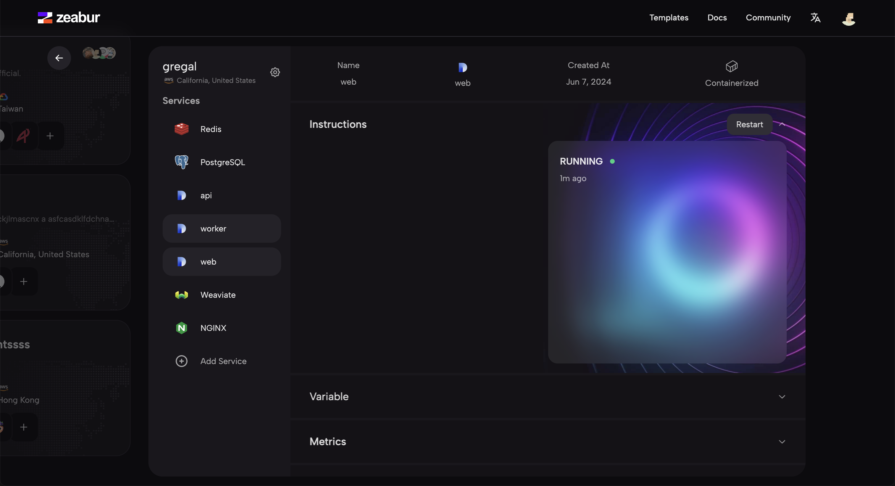 部署完成后,你可以在 Zeabur 控制台中看到一个项目页面,如下图所示,你在部署过程中输入的域名将自动绑定到 NGINX 服务,你可以通过该域名访问你的 Dify 实例。