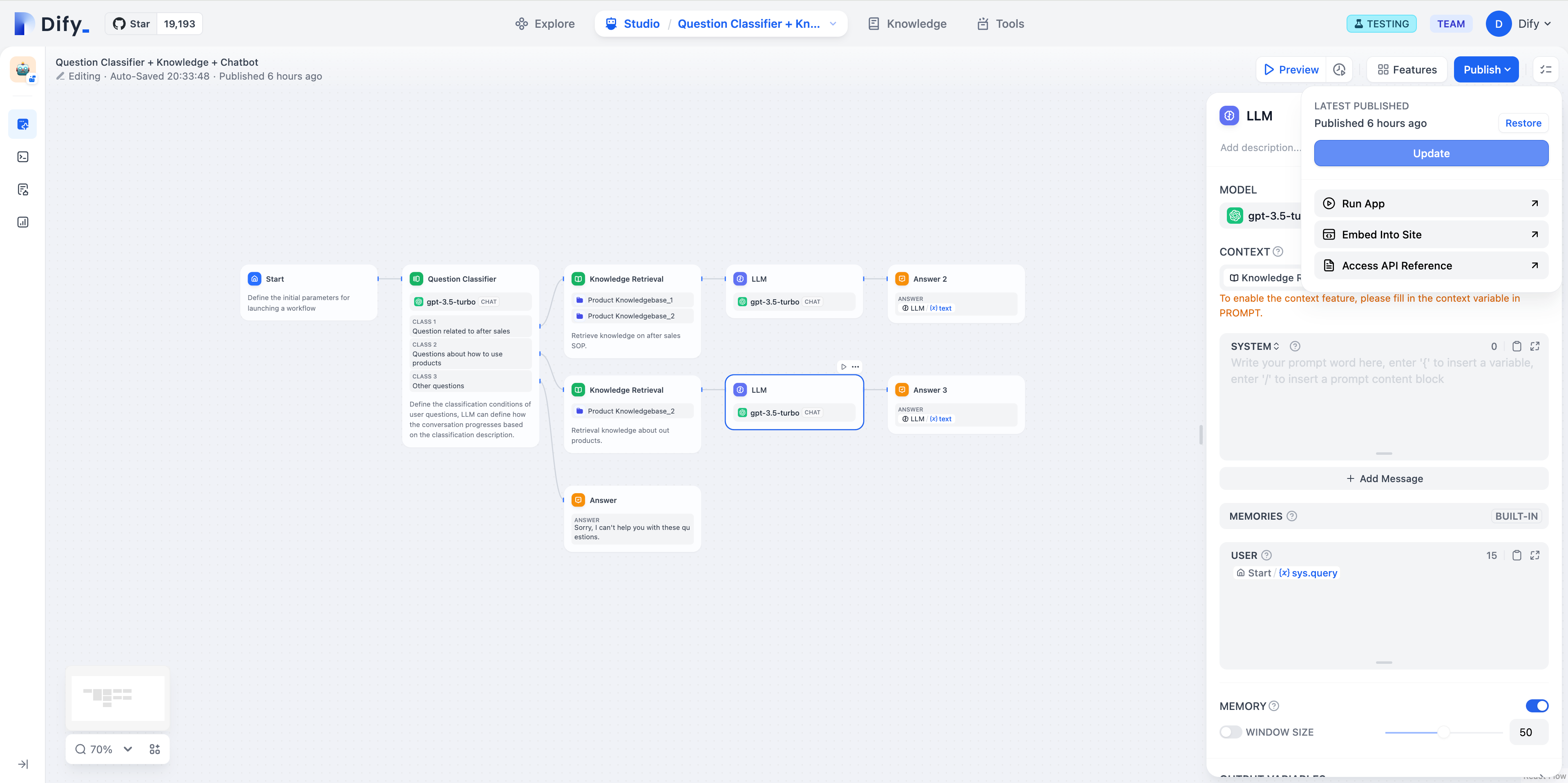 调试完成之后点击右上角的「发布」可以将该工作流保存并快速发布成为不同类型的应用。