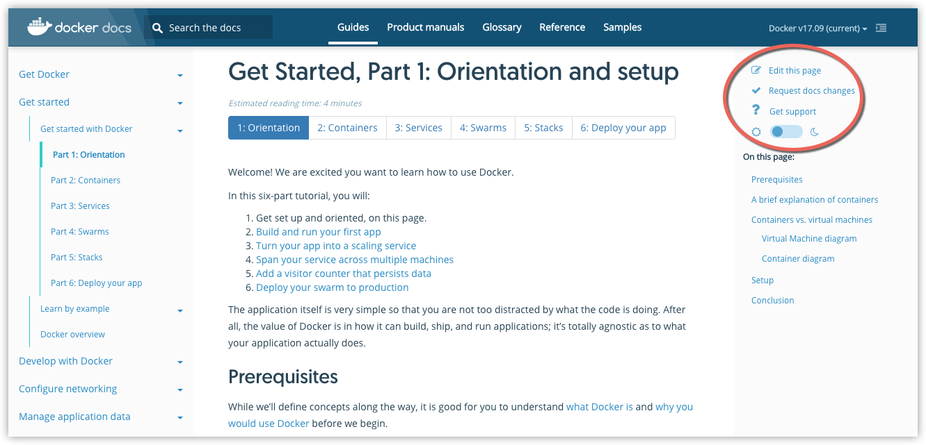 * pared down contributor's guide to docs specifics Signed-off-by: Victoria Bialas <victoria.bialas@docker.com> * incorporated review comments Signed-off-by: Victoria Bialas <victoria.bialas@docker.com>