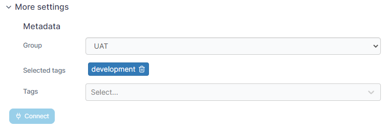 As an optional step you can expand the More settings section to categorize the environment by adding it to a group or tagging it for better searchability.