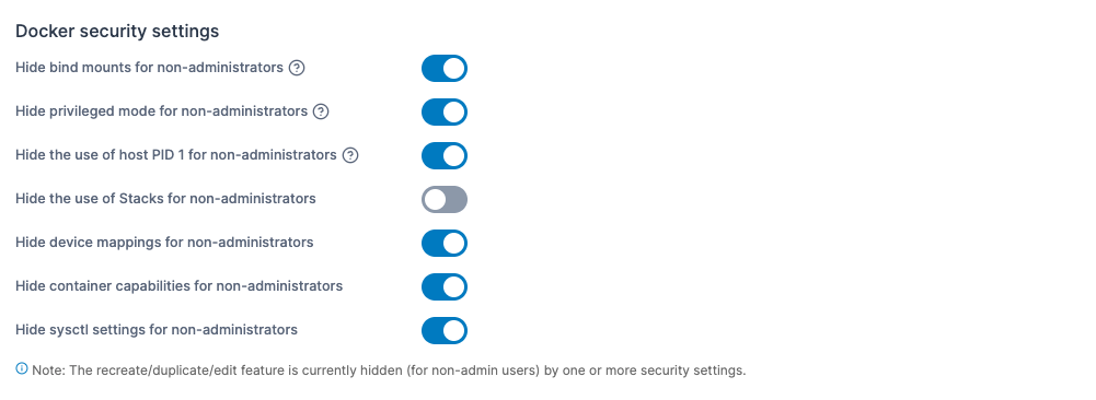 This section allows you to toggle assorted Docker-related security settings for the environment.