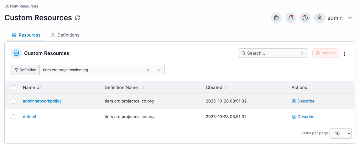 Custom Resource Definitions (CRDs) extend the Kubernetes API to define new resource types in a cluster. From the Custom Resource view, admin users can review both Custom Resources and Custom Resource Definitions directly.