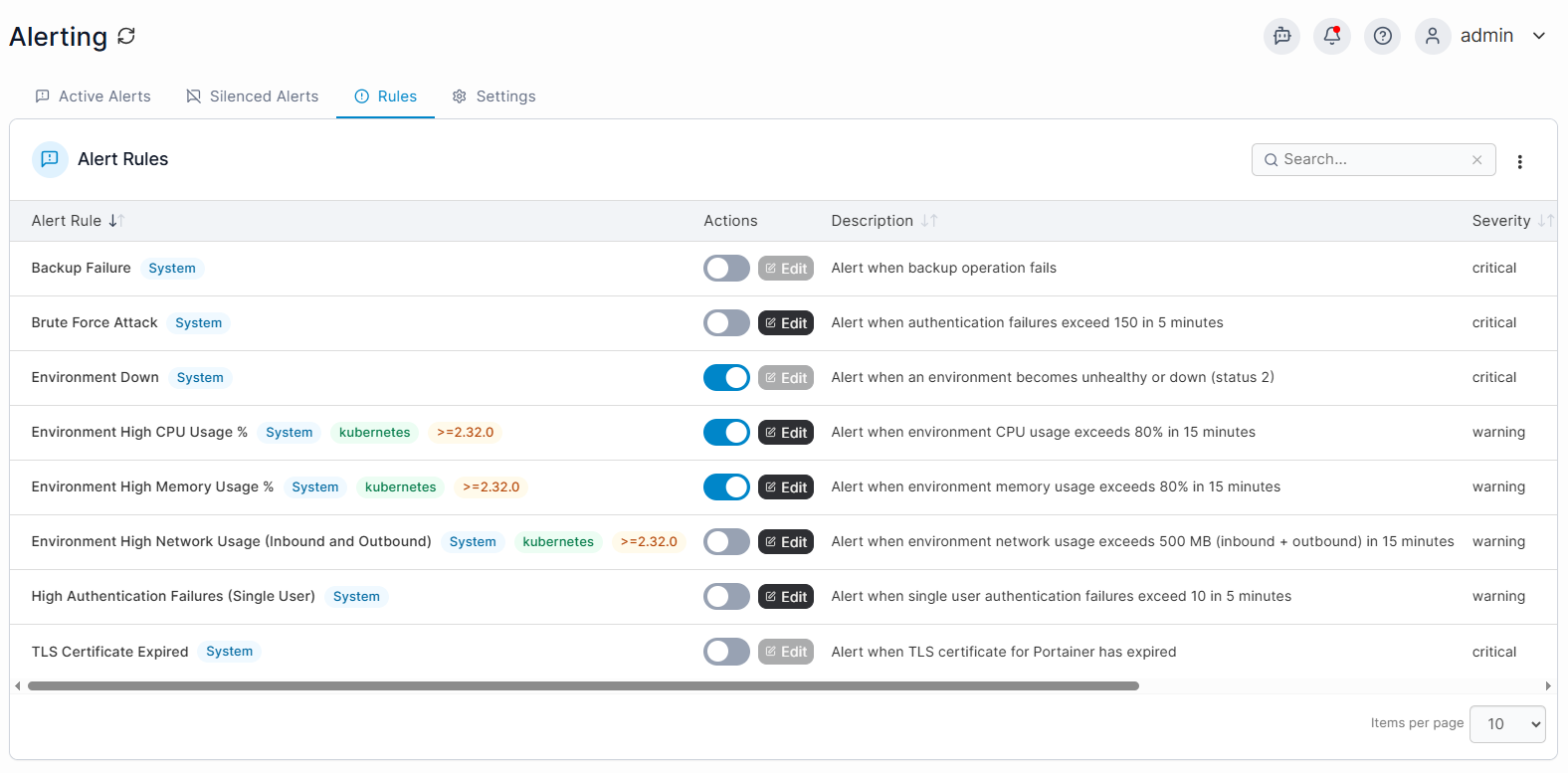 In earlier releases, we introduced alerting as an experimental feature, allowing administrators to configure alerts based on conditions such as environments going offline, failed backups, or high resource usage. Since then, we’ve refined and improved the feature, and in 2.39 alerting is now generally available. Administrators can enable alerting under Observability from the Additional Functionality section, making it easier to monitor environment health and react to issues without relying solely on external tooling.