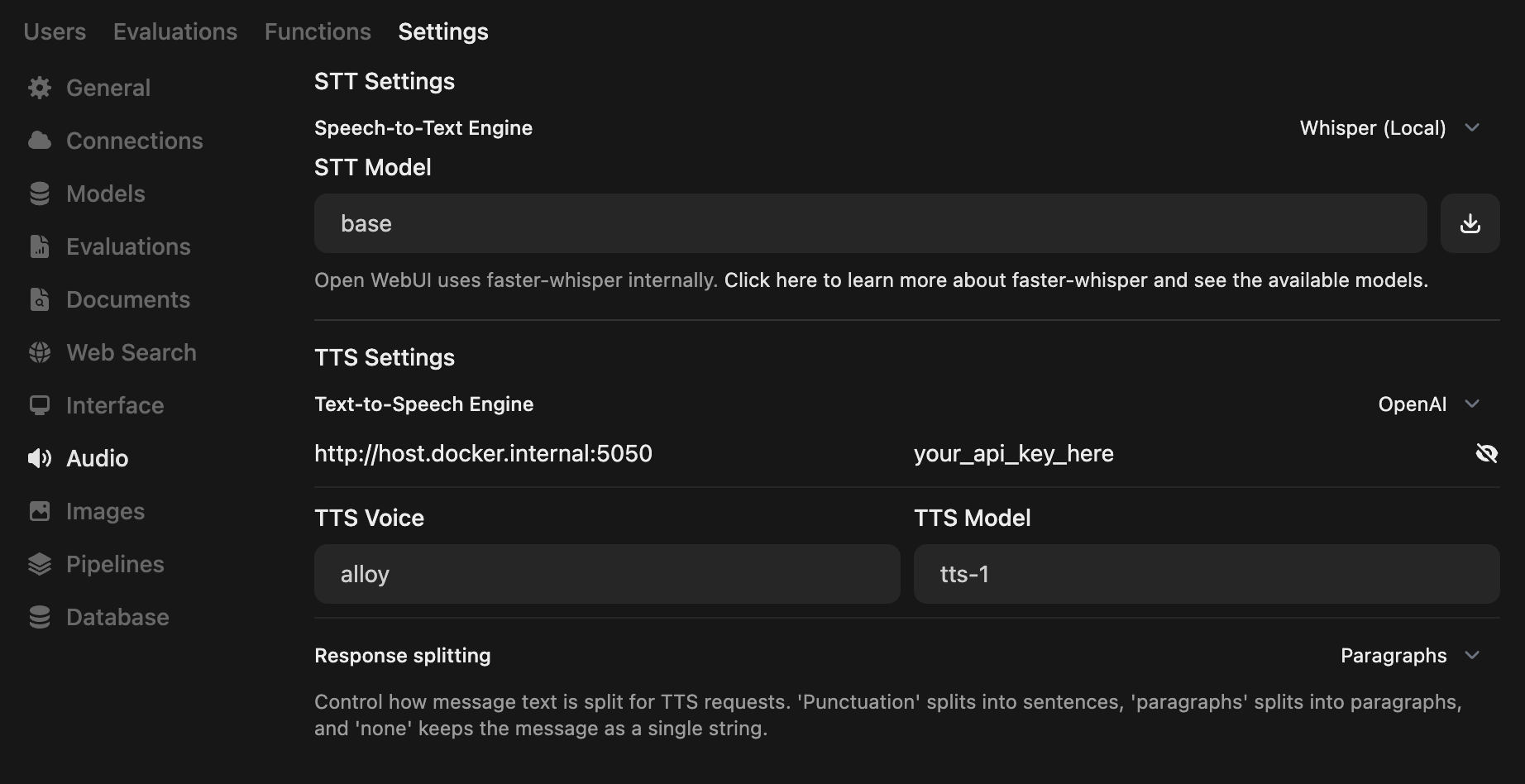 Screenshot of Open WebUI Admin Settings for Audio adding the correct endpoints for this project